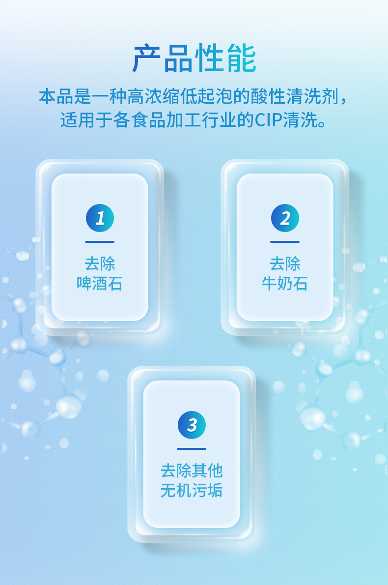 2、對(duì)用戶友好:采用食品級(jí)原材料。按指導(dǎo)操作,對(duì)不銹鋼無腐蝕,對(duì)橡膠類密封件相對(duì)溫和。