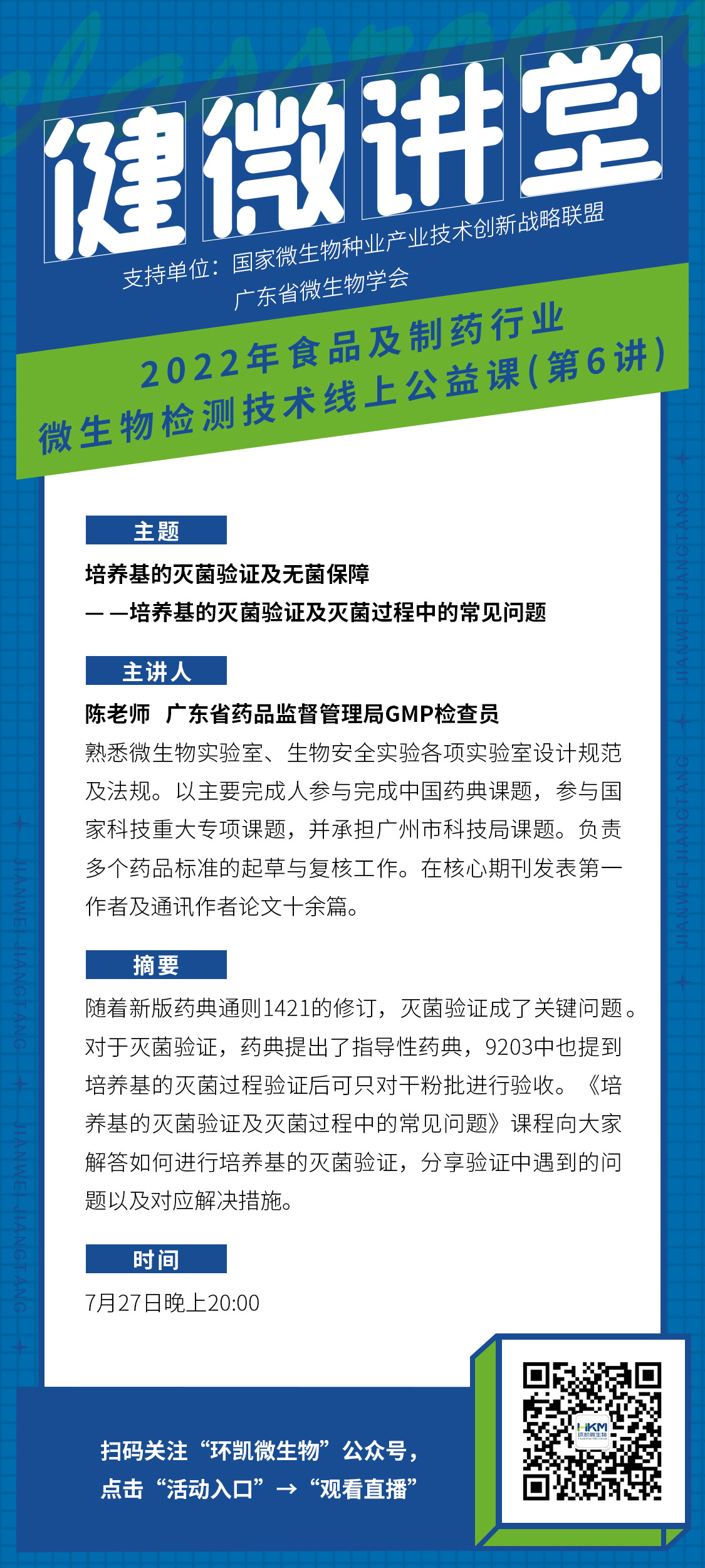 健微講堂”食品及制藥行業(yè)微生物檢測技術(shù)系列公益課第四講,即將于7月13日晚20點準時免費開播!