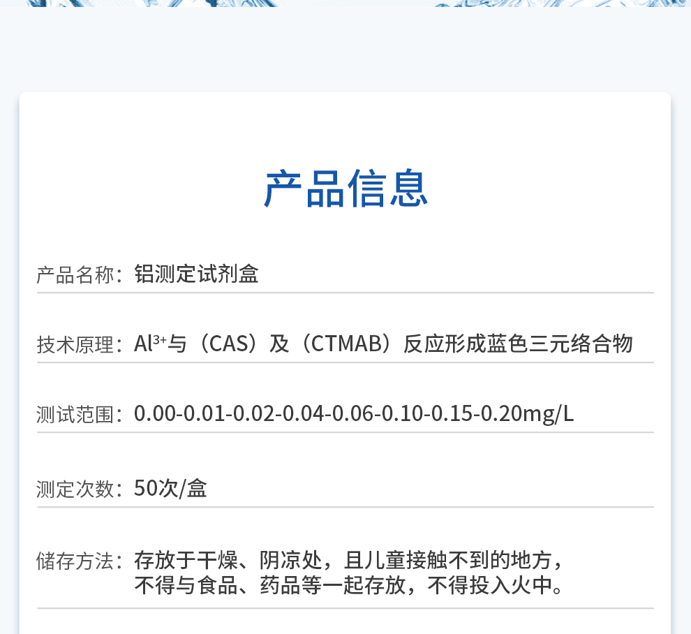 【產(chǎn)品名稱(chēng)】鋁測(cè)定試劑盒 0.00-0.20mg/L
