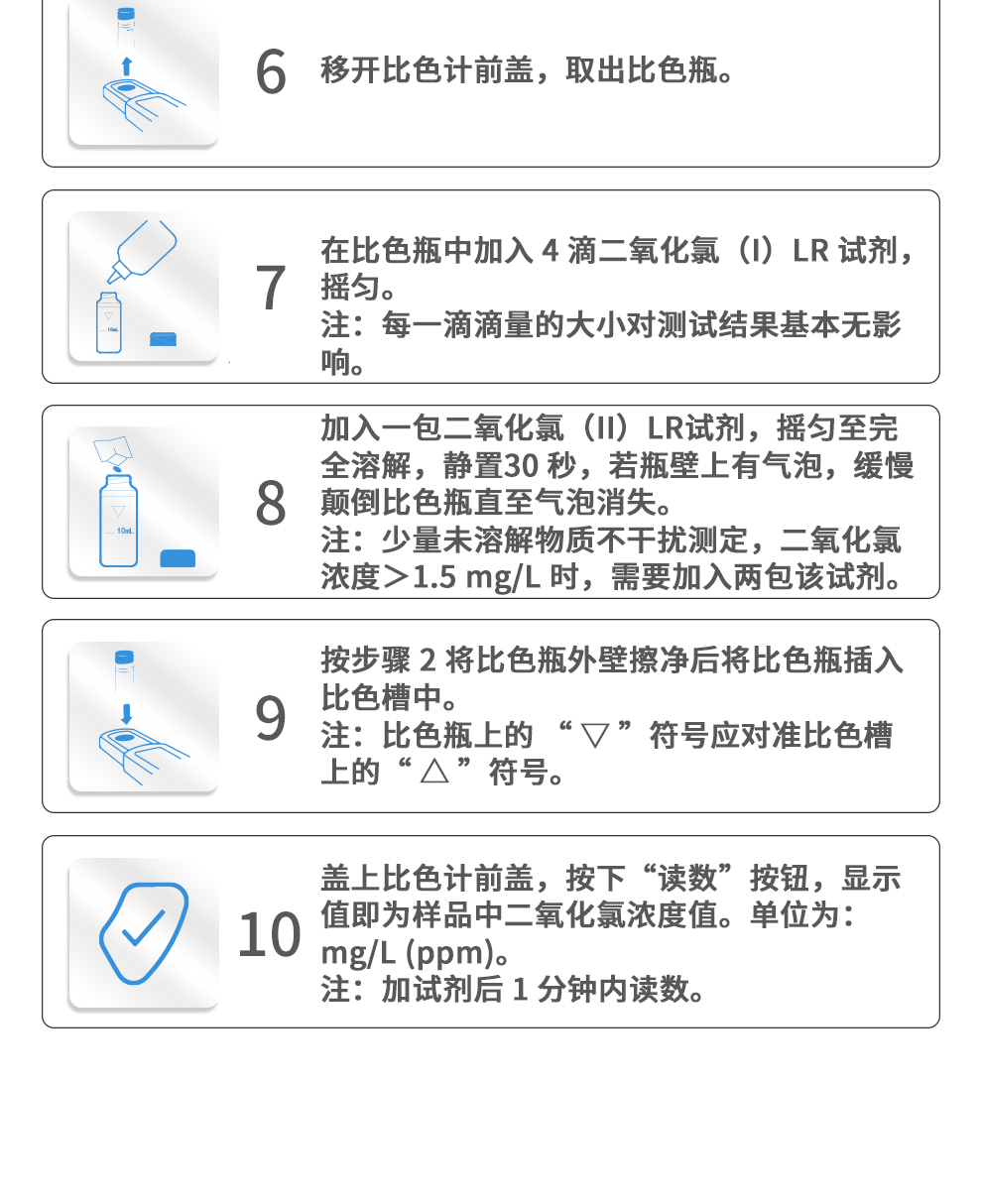 【測定范圍】臭氧:0.01~2.50mg/L、余氯、總氯:0.02~3.00mg/L、二氧化氯:0.04~5.00mg/L