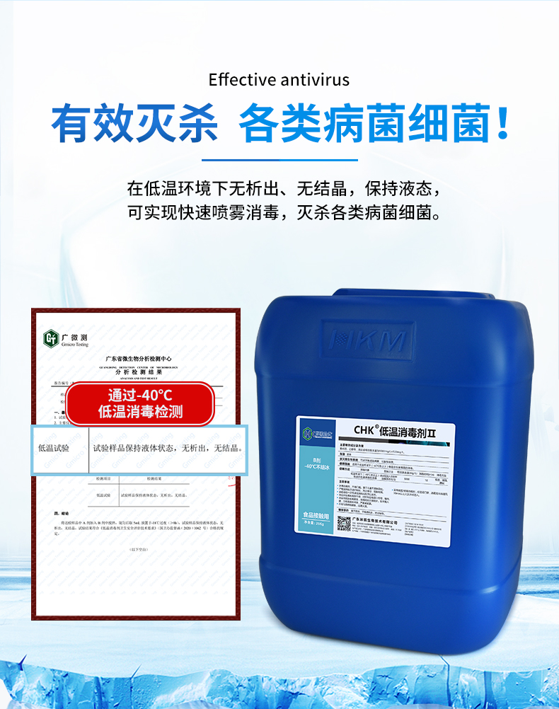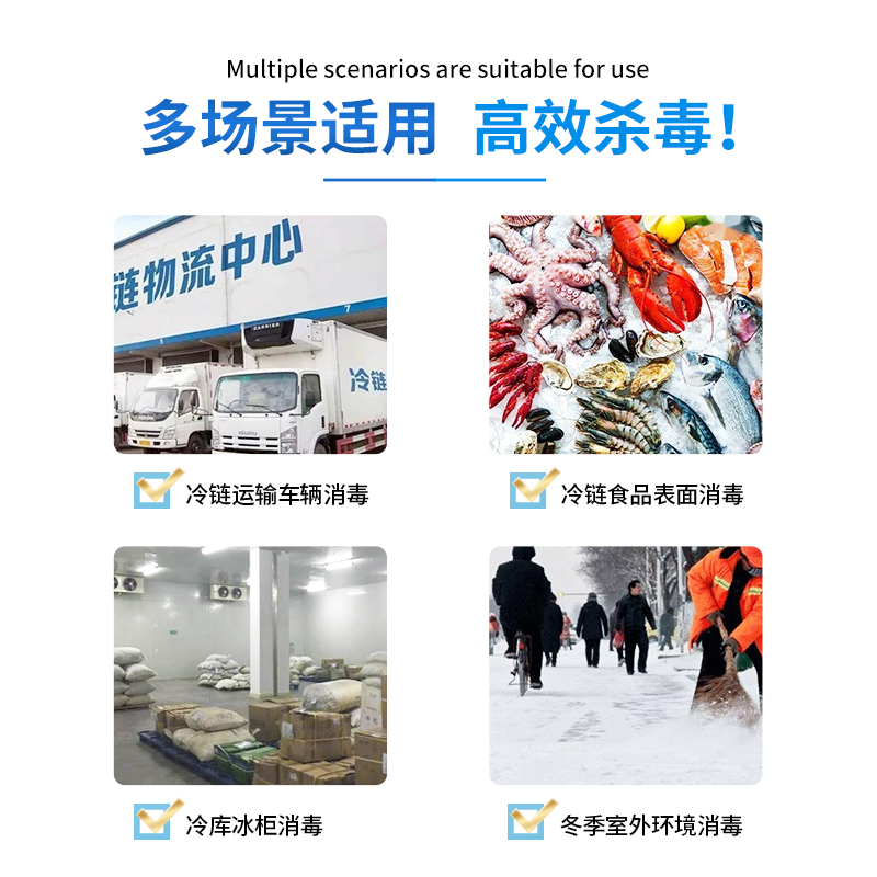 1、低溫環(huán)境不結冰:適用于-40°C及以上低溫環(huán)境下硬質物體表面及物品外包裝表面的消毒。