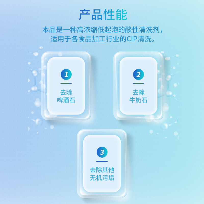 1、清洗效果好:CIP酸性清洗劑是一種無色、無味、無泡、濃縮的酸性清洗劑。強力去除頑固復(fù)雜的礦物質(zhì)污垢、乳垢。在堿性清洗完成后,用它作為酸洗劑,能防止乳石、石灰及其他礦物質(zhì)的積聚。