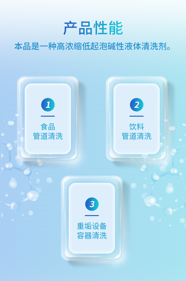 1、清洗效果好:CIP堿性清洗劑為濃縮液體堿性清洗劑,具有合理的平衡配比、卓越的耐硬水性能,對脂肪、蛋白質(zhì)等熱變性復(fù)雜污垢的分解去除力強。