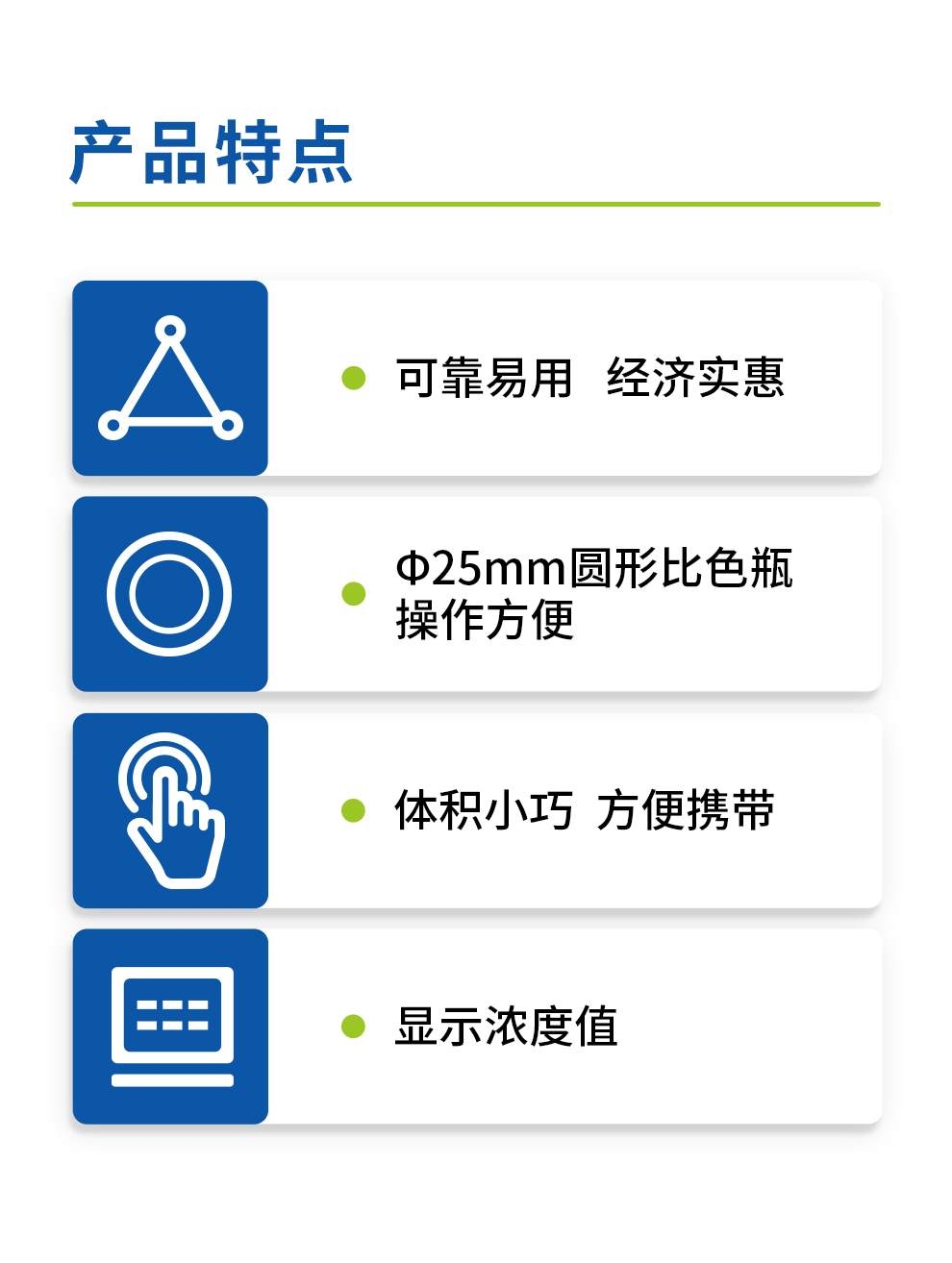 1.產(chǎn)品基于分光光度法原理,計算樣品濃度,配套檢測試劑與內(nèi)置曲線,用戶僅需少量的樣品即可輕松完成測試。