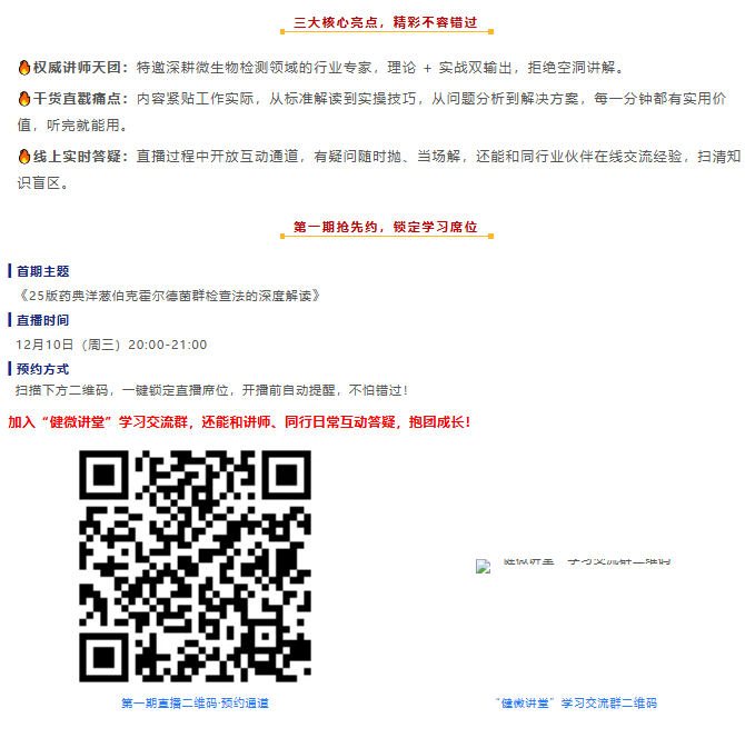 還在為25版藥典新增微生物檢驗(yàn)內(nèi)容如何實(shí)施發(fā)愁?還在為食品微生物檢測(cè)難題卡殼焦慮?還在為微生物快檢技術(shù)如何合規(guī)應(yīng)用犯難?“健微講堂” 線上系列講座重磅啟航!