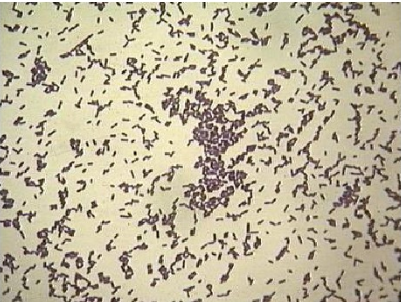 李斯特氏菌為革蘭氏陽(yáng)性短桿菌(圖3),大小為(0.4μm~0.5μm)×(0.5μm~2.0μm);用生理鹽水制成菌懸液,在油鏡或相差顯微鏡下觀察,該菌出現(xiàn)輕微旋轉(zhuǎn)或翻滾樣的運(yùn)動(dòng)。