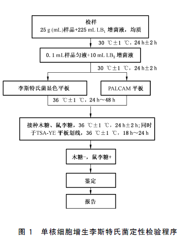 以無(wú)菌操作取樣品25g(mL)加入到含有225mL LB1 增菌液的均質(zhì)袋中,在拍擊式均質(zhì)器上連續(xù)均質(zhì)1min~2min;或放入盛有225mL LB1 增菌液的均質(zhì)杯中,以8000r/min~10000r/min均質(zhì)1min~2min。于30℃±1℃培養(yǎng)24h±2h,移取0.1mL,轉(zhuǎn)種于10mL LB2 增菌液內(nèi),于30 ℃±1℃ 培養(yǎng)24h±2h。